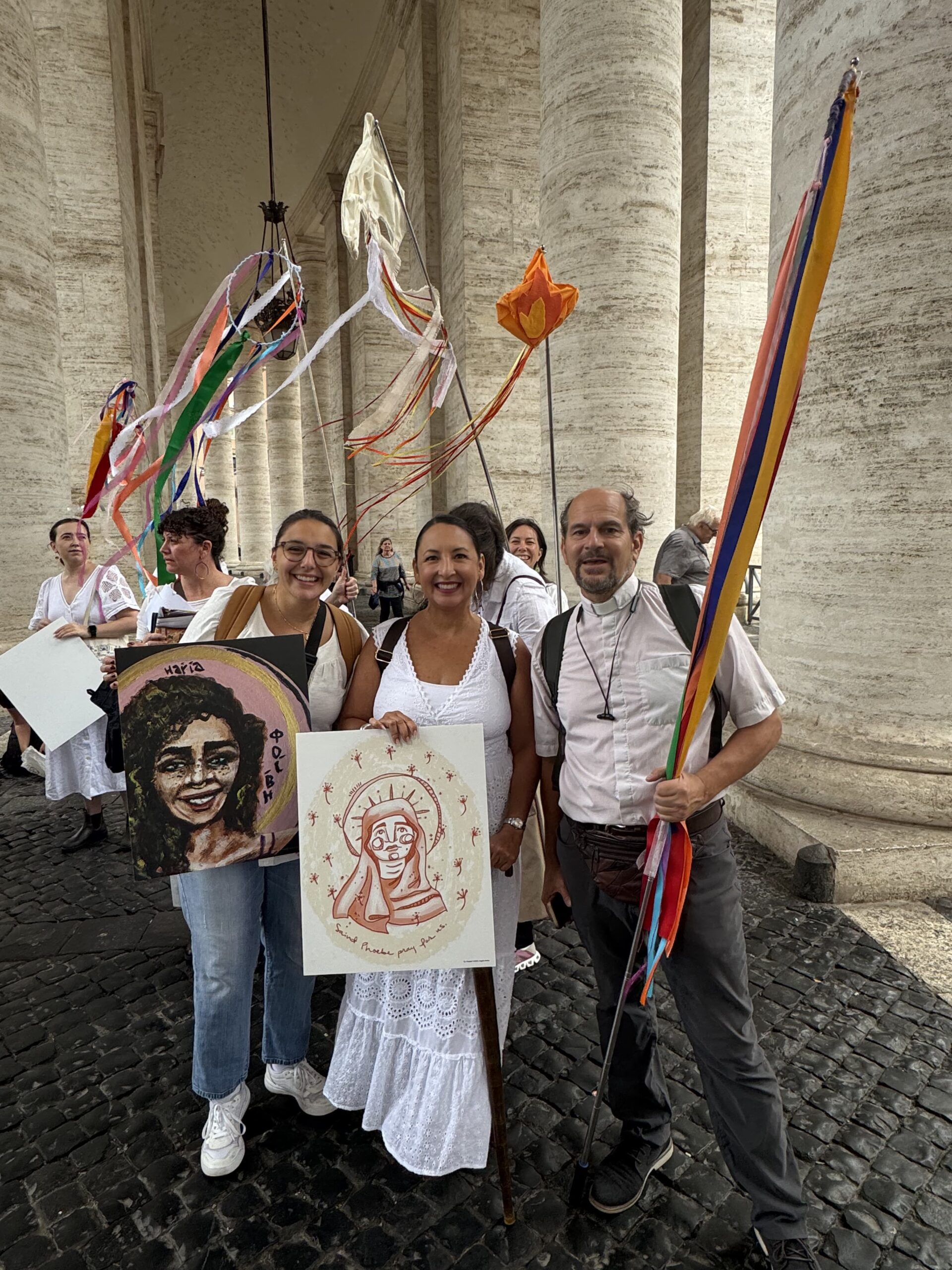 Durante nuestra estancia en Roma, hicimos visibles las estatuas de mujeres diáconas sobre la columnata de la Plaza de San Pedro. Compartimos las historias de estas y otras santas notables con estudiantes universitarios y de posgrado como parte de Synodality CENTERS, una colaboración creativa de 15 universidades de EE.UU. que están sembrando semillas para una iglesia sinodal a través del compromiso con jóvenes adultos, teólogos y ministros universitarios. Haz clic aquí para conocer a las mujeres de la columnata – Mujeres de valentía y confianza.