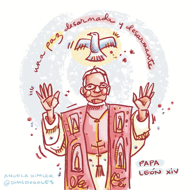 Después procedió a saludar personalmente a cada peregrino, y muchos le entregaron cartas de migrantes de sus comunidades que se enfrentan a niveles de miedo sin precedentes. Mi regalo al papa León fue la imagen que Angela Dimler (una discerning deacon) hizo de él la semana de su elección. Su obra de arte realza la descripción que el papa León hizo de la paz de Cristo resucitado en su primer discurso en la plaza de San Pedro: “Una paz desarmada y desarmante”.
